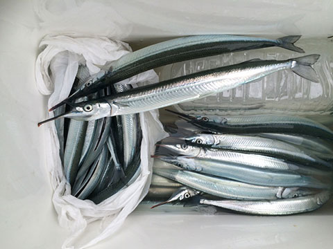 サヨリ25cm〜35cm、88匹 餌はオキアミのS、撒き餌にアミ入り米ぬか、のべ竿5.4m.ハリス0.6号、