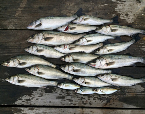セイゴ53〜37cm、17匹、餌:シラサエビ、